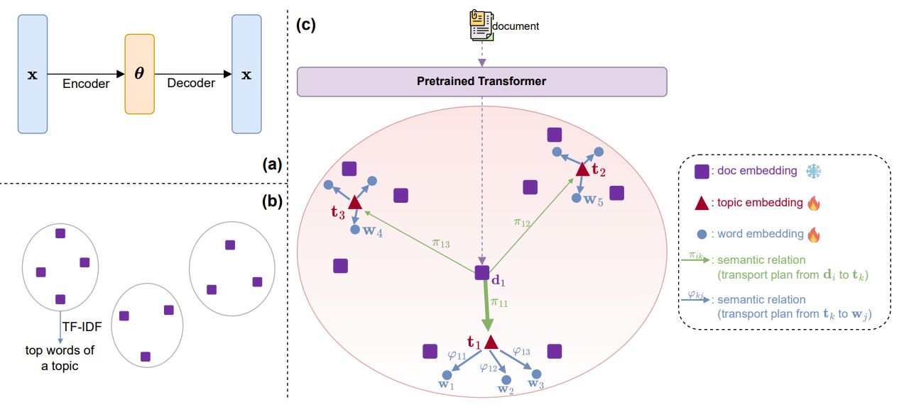 FASTopic, instead of reconstructing Bag-of-words, like classical topic models or VAE-based models do, reconstructs the relations between topics words and documents.